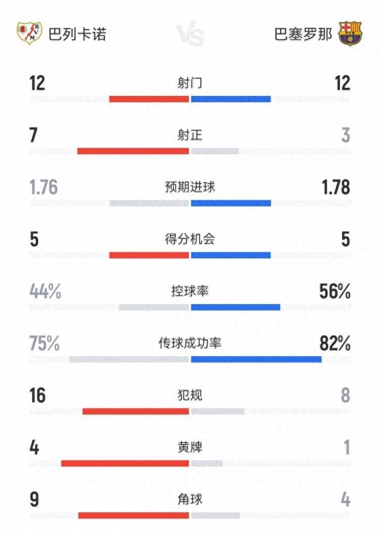 巴萨1-1巴列卡诺数据:射门12-12射正3-7,得分机会5-5