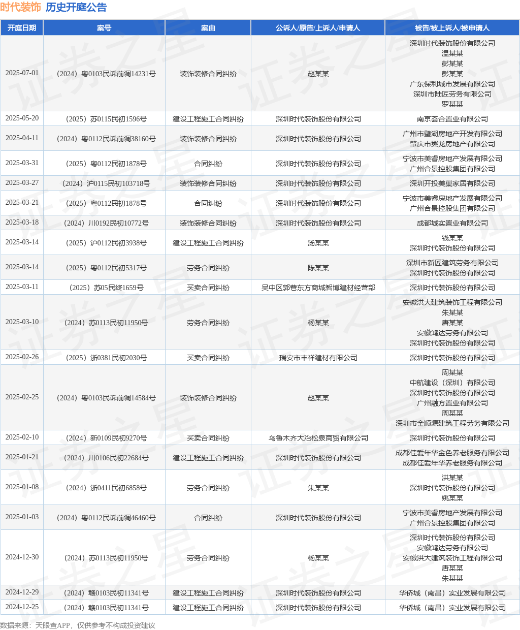 案号:(2025)浙0381民初2030号审理法院:瑞安市人民法院案由:买卖合同纠纷当事人信息: 原告/上诉人:瑞安市丰祥建材有限公司 被告/被上诉人:深圳时代装饰股份有限公司开庭日期:2025年2月26日根据统计,近一年内以深圳时代装饰股份有限公司为当事人的历史开庭公告有104则,其中案由为“劳务合同纠纷”的公告以26则居首,其次为“建设工程施工合同纠纷”有15则,“劳动争议”有10则。历史开庭公告(前20条)如下: